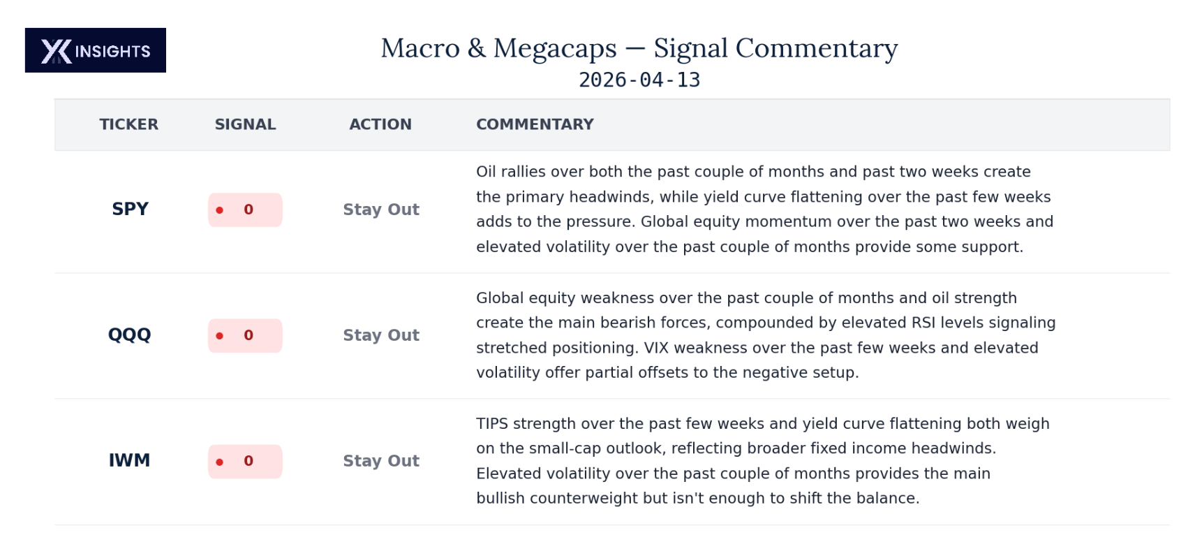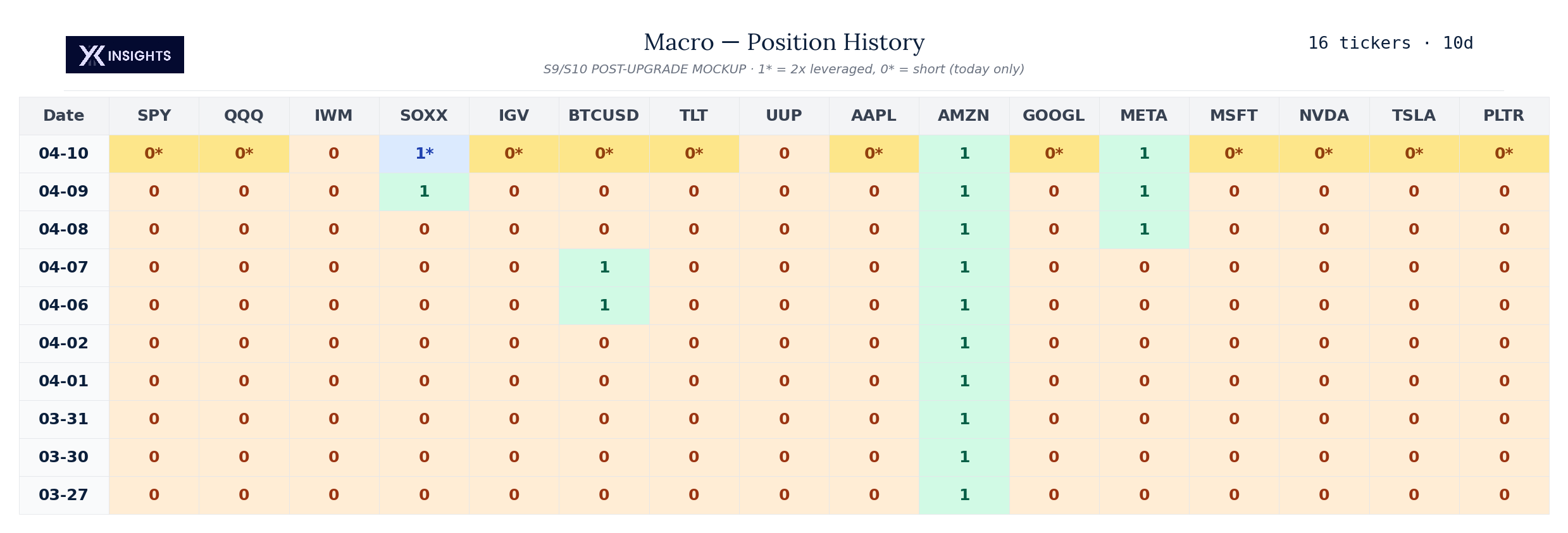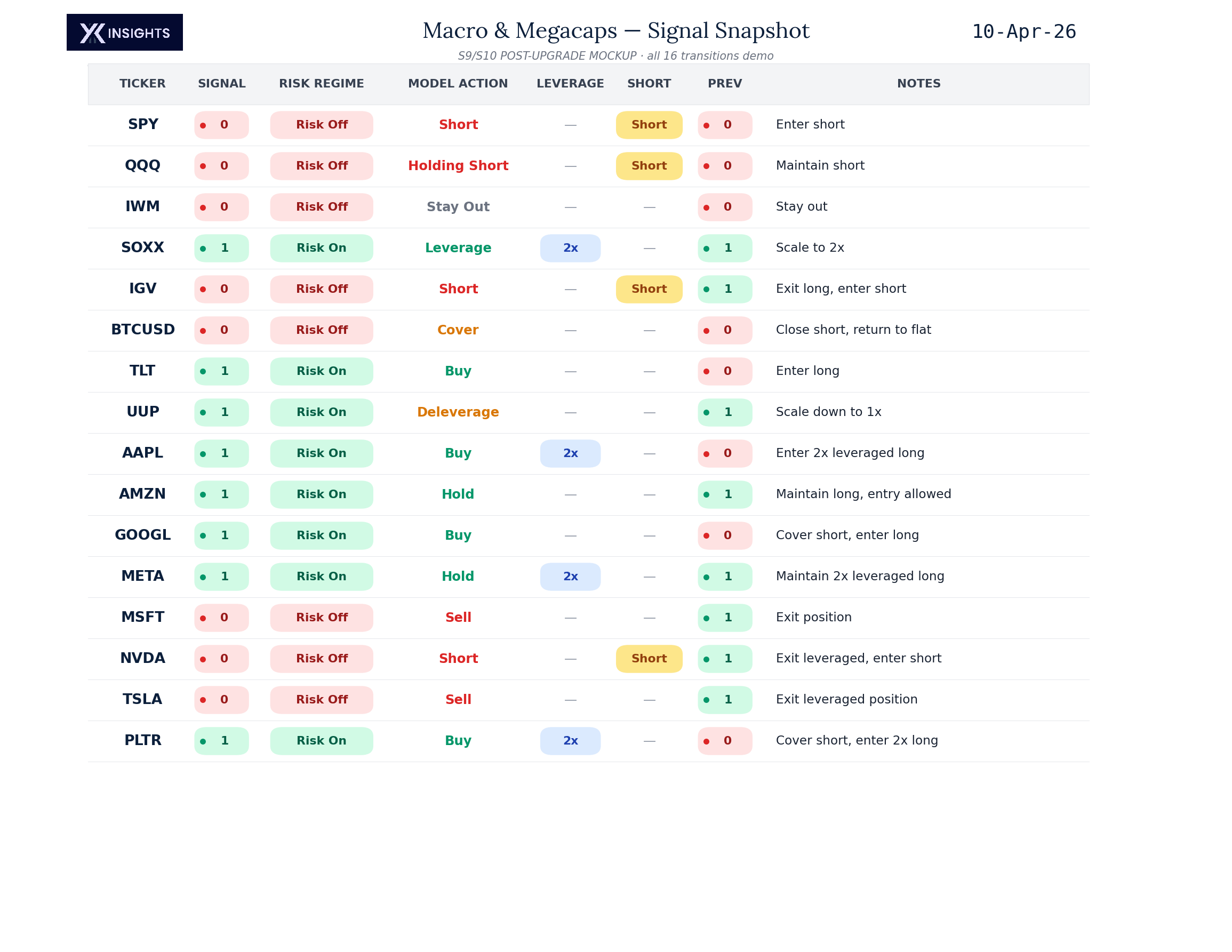 Signal Snapshot. The current signal for every ticker in the suite, with position changes clearly flagged. This is the actionable output.
