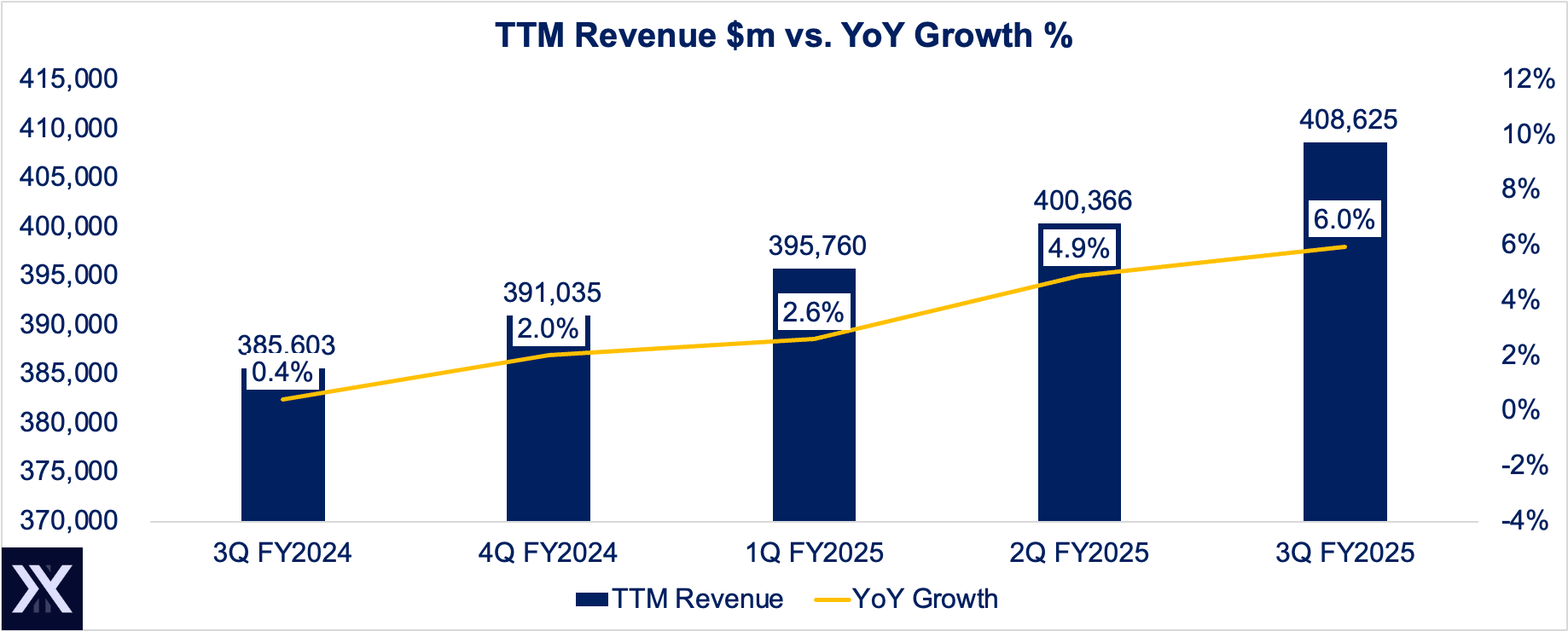 On a trailing-twelve-month basis, AAPL’s revenue sits at $408 billion, with 6% growth. While still in the single digit territory, at least that growth line is moving in the right direction.
