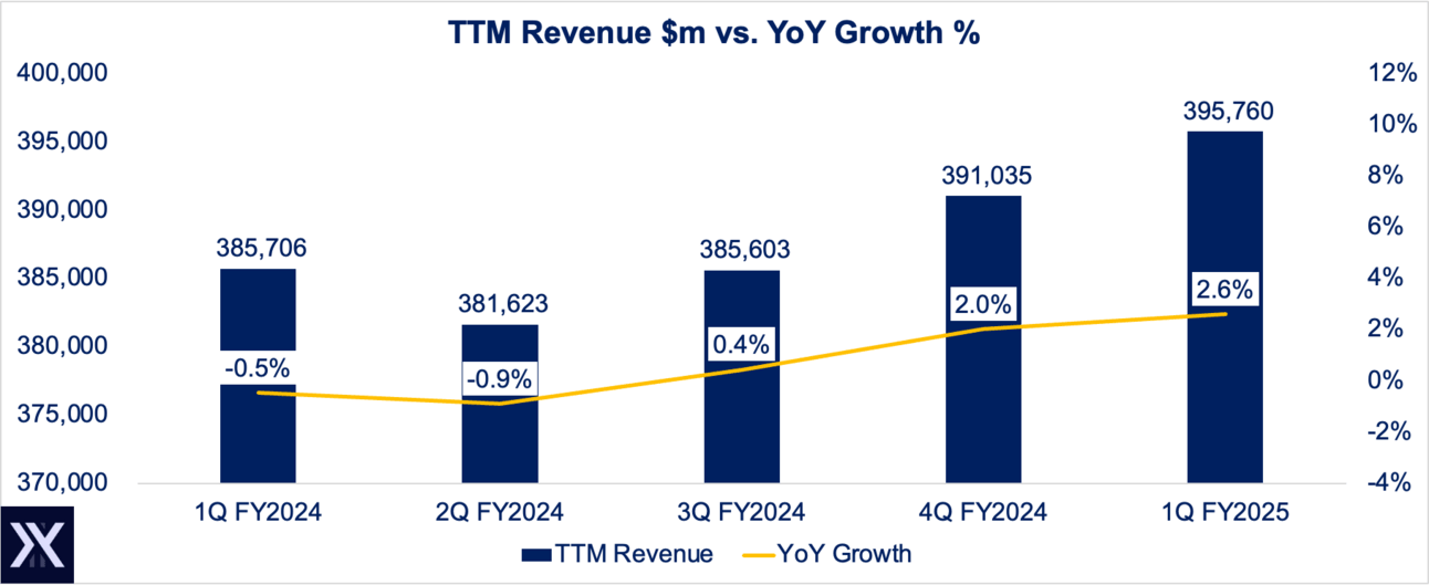 Apple’s trailing twelve month (TTM) revenue reached $396 billion in Q1, up 2.6% YoY. While some growth is better than nothing, Apple’s sales trend is hardly inspiring. This is particularly relevant when it comes to valuation.