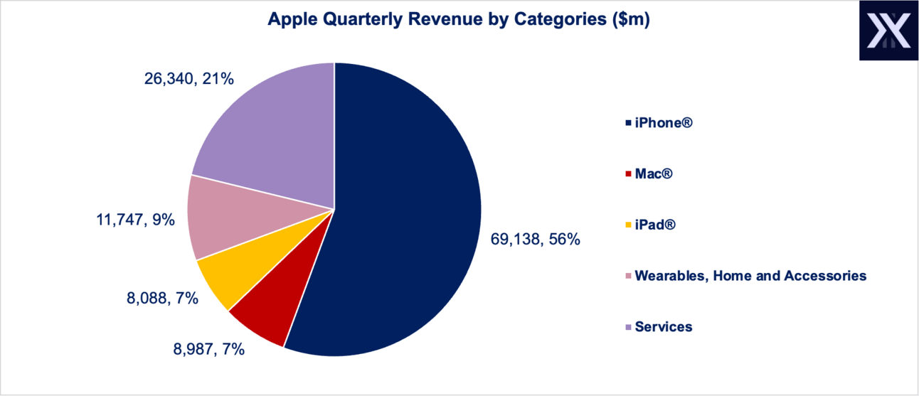 Services bring 21% of the revenue, reaching $26 billion. They include Apple TV, App Store, and Apple Pay, cloud services, and advertising revenues.