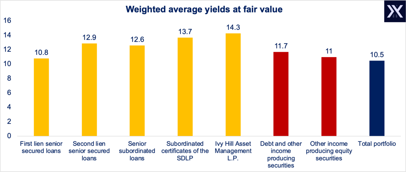 In terms of yields across ARCC’s investments at fair value, Ivy Hill is producing the highest return. On average, the yields are pretty tidy across the different loan classes, with a weighted average yield of 10.5% on portfolio’s fair value.