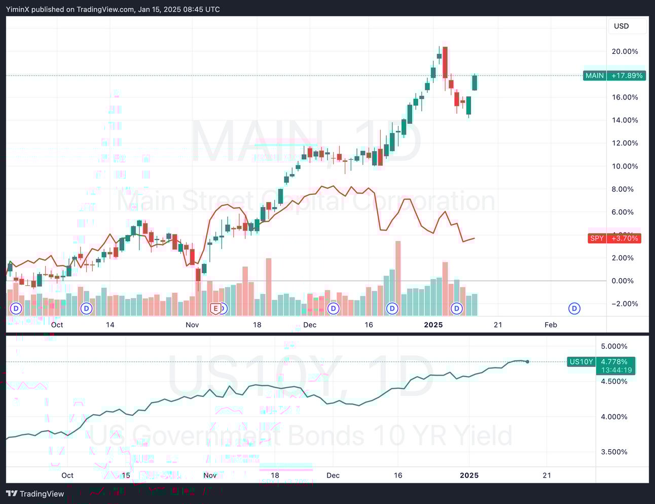 If you compare MAIN with SPY since the September FOMC, MAIN initially moved in line with SPY, but MAIN has led the index ETF by a wide margin after mid-November.
