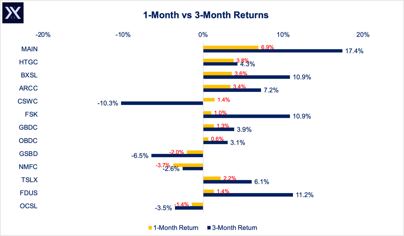 BDCs generally have responded well to the higher bond yields, with many of them outperforming SPY in the past 3 months (unadjusted for dividends), including MAIN, BXSL, ARCC, FSK, and FDUS.