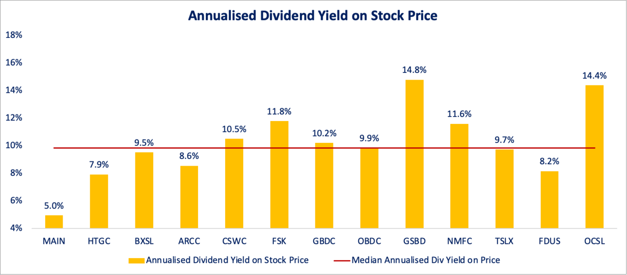 MAIN is now trading at a 5% annualised dividend yield, which is currently just 22bp above the 10-year Treasuries. Not an enticing choice in my opinion.