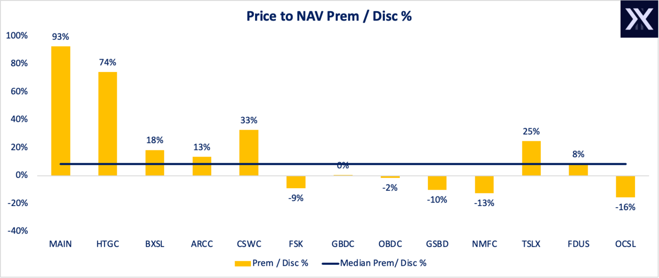 MAIN leads the group with the highest price premium to NAV at 90%. For reasons beyond my own comprehension, there seems to be a buzz around the investor community on MAIN as a high quality fund.