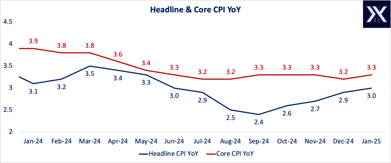 Headline CPI increased by 0.5% MoM, a rare beat of 0.2% on the consensus, bringing the YoY measure to 3.3%, up from December’s 3.2%.