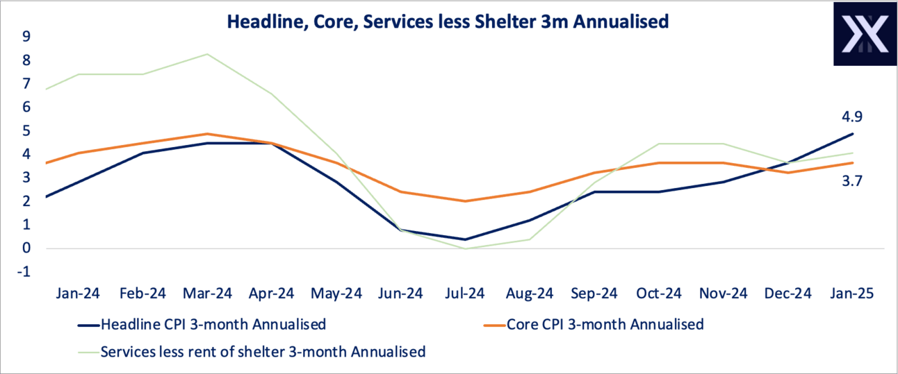 The Headline CPI has moved from a low of 2.4% YoY in September to 3% today in just 5 months, coinciding with the beginning of the Fed’s cutting cycle. Core CPI now looks to be forever stuck in the 3.2-3.3% region. In short, CPI is now moving away from the Fed’s target.