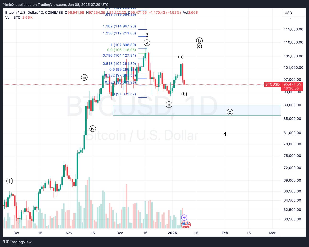 First, that wave circle-b looks incomplete as I would expect 3 waves up from wave (a) to wave (c) on the chart. Wave circle-b in a regular flat structure in Elliott Waves should reach 90% of wave circle-a, which is around $106k (highlighted in green).