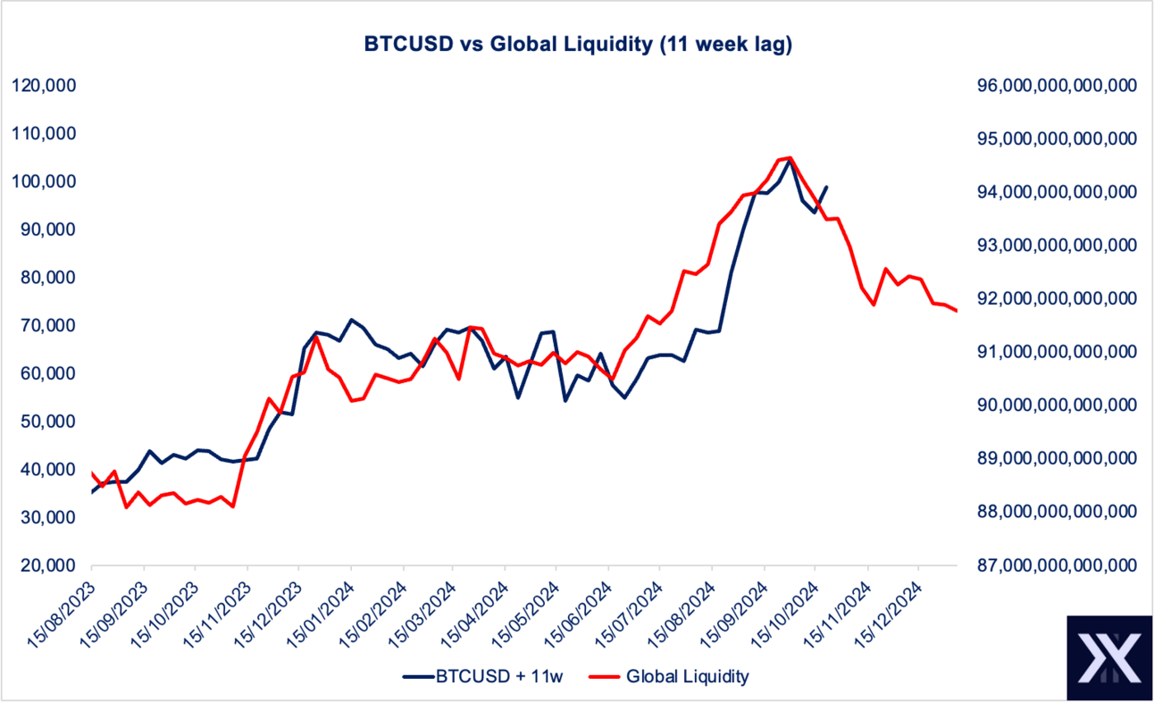 Bitcoin is still tracking the Global M2 changes quite well, with a 10-12 week lag. The recent decline in Global M2 is primarily due to a relentless stronger USD since the Fed’s September rate cute. A declining Global M2 has lead the downward moves in both Gold and Bitcoin.