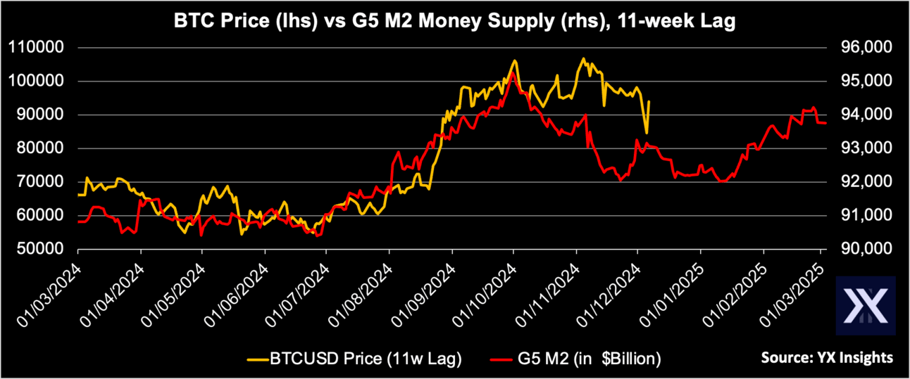 We observe that Bitcoin moves directionally in line with the rise and fall of the G5 M2 Money Supply denominated in US Dollars, but with an 11-week lag. The rise in G5 M2 between July and October drove a big rally for Bitcoin between October and December, from $60k to $107k.