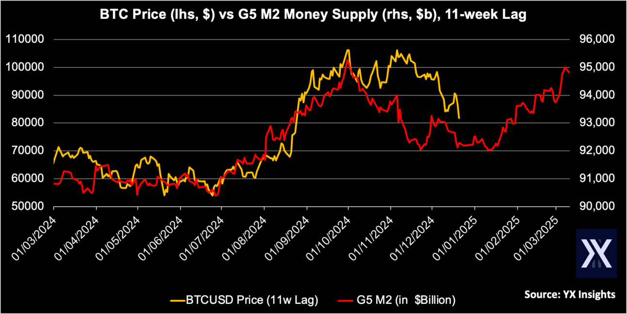 We use the G5 (US, China, EU, Japan, UK) M2 Money Supply to approximate the changing dynamics of global liquidity. The true comprehensive set of measures is broader, including other countries M2s, high quality bond collaterals, and FX swaps, but what we track here already holds high explanatory power, without getting overcomplicated.