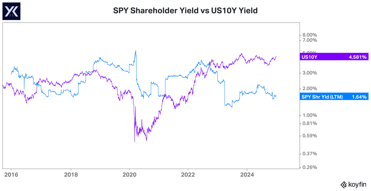 Shareholder yield is based on three important components compared to the market cap (calculated by Koyfin):