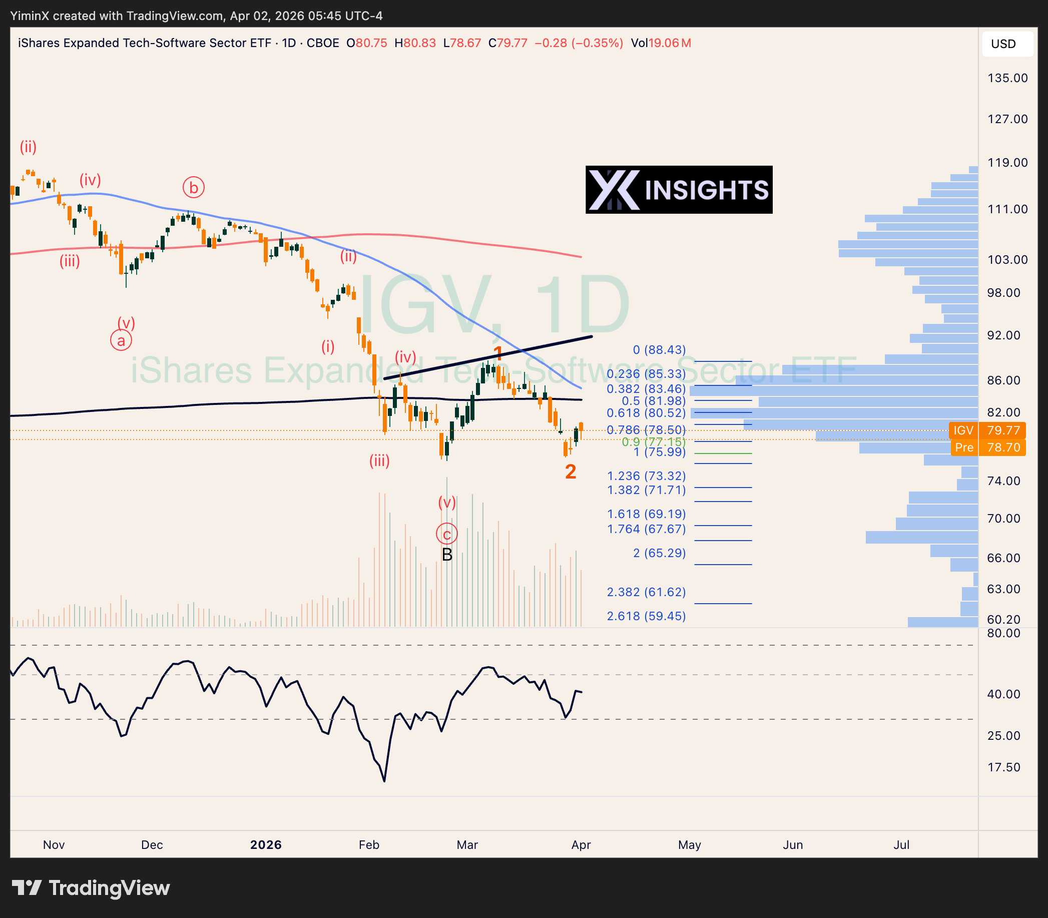 AMD’s March rally was in a clear 3-wave structure, making it counter-trend. It is pinned in a neutral zone between the 50 and the 200-day MAs. I would not be surprised to see one more flush lower in wave (5).
