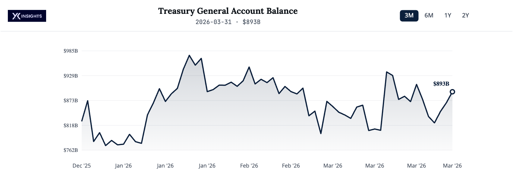 The Treasury General Account ended Tuesday, March 31, at $893bn, up from $868.48bn on March 30th. This $24.52bn daily increase represents the largest single-day build since March 23, when the TGA jumped to $909.51bn.