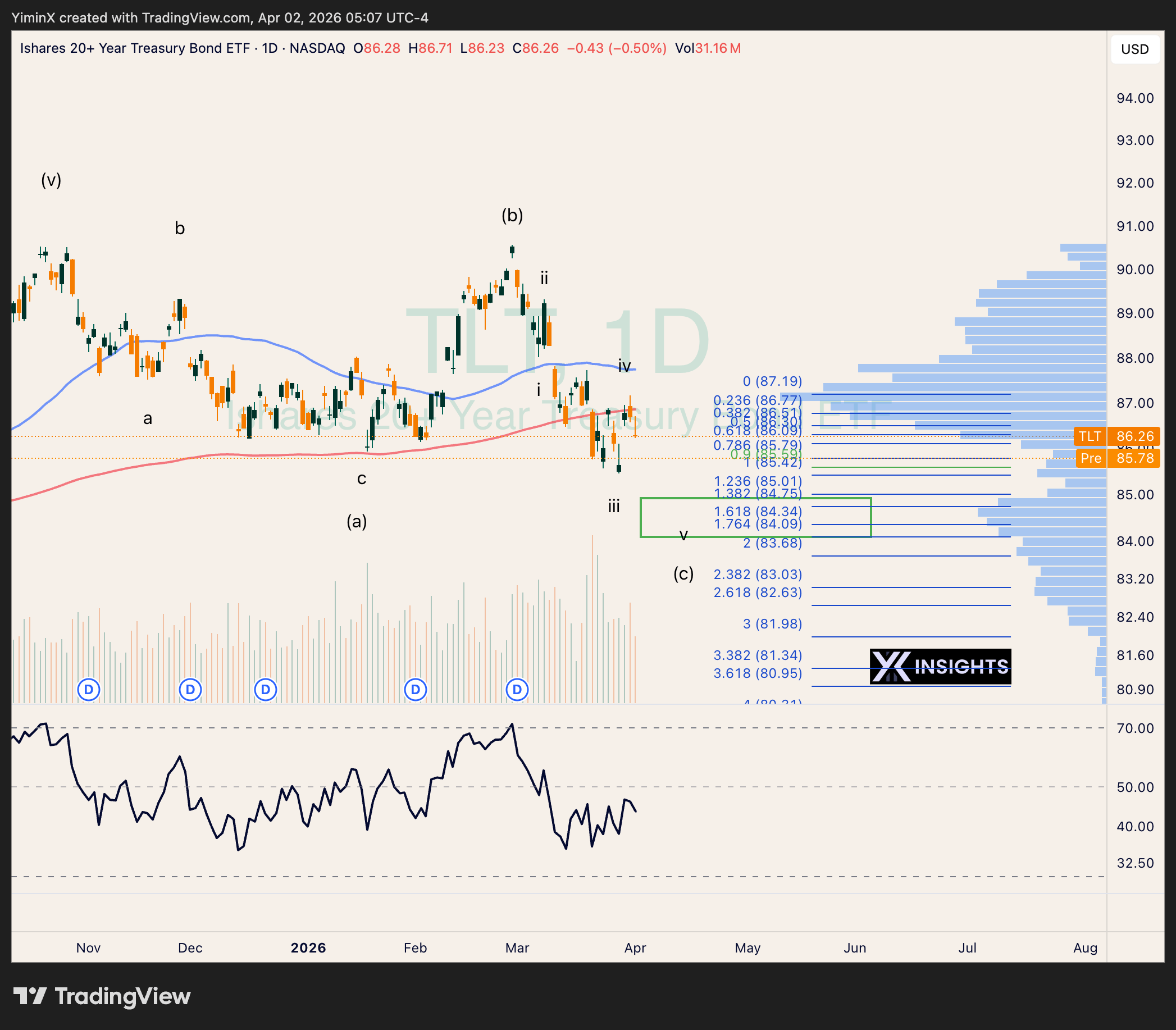 TLT has retested and failed again at the 200-day MA. Wave v could test one more low below $85.