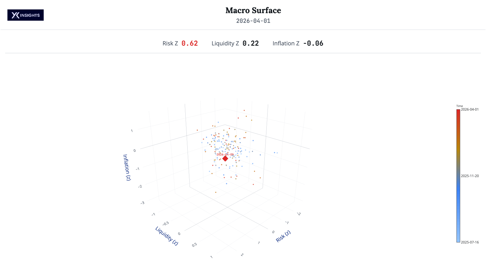 Risk appetite pulled back to +0.619z on Wednesday, April 01, down from the +2.495z spike we saw on 31 March. Liquidity conditions also cooled to +0.223z from +0.850z, while inflation expectations turned slightly deflationary at -0.063z.