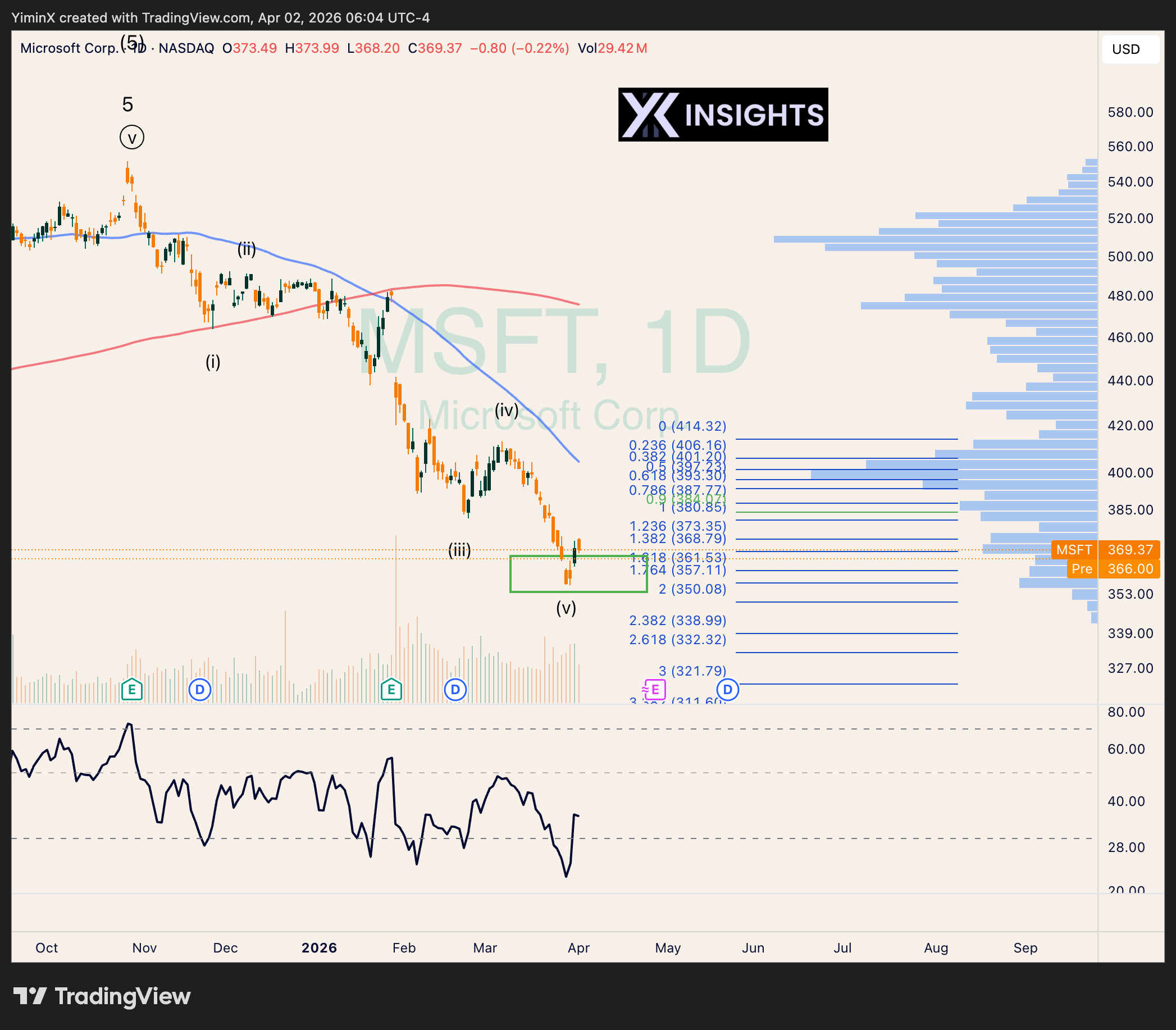 TSLA is in a pretty clear near-term downtrend. The Elliott Waves counts, however, are slightly less clear. $340 provides significant support for a bottom, which I have identified as the likely downward target.