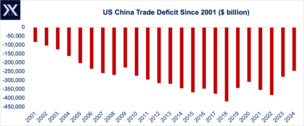 Firstly, the US-China trade deficit has substantially decreased since the 2018 peak, from $418 billion to $245 billion in 2024.