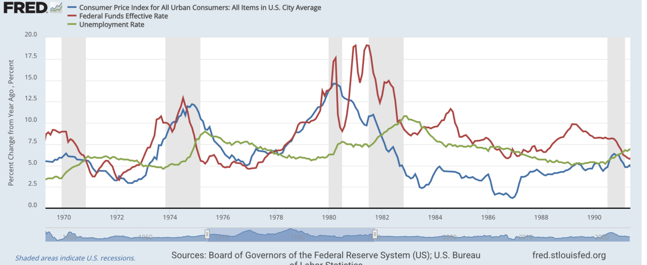 In late 1970s, Volker ignored the rising unemployment and focused on putting inflation to bed. However the result was that after raising the Fed Funds rate to 19%+, a recession was triggered with unemployment rising to 10%.