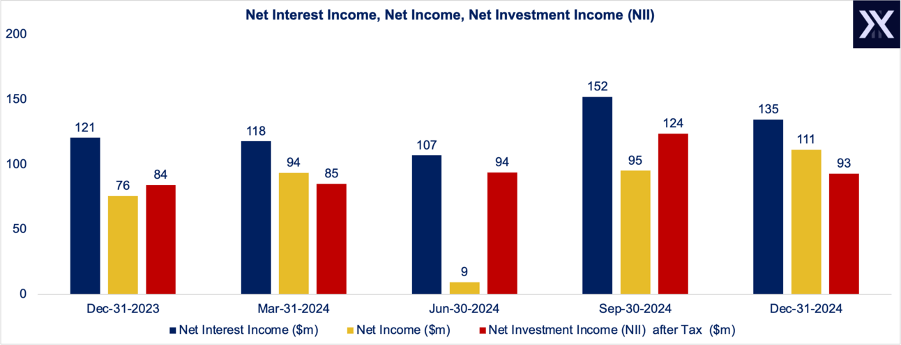 While the tightening spread explains some of the drop in Net Investment Income, there was also a $5 million rise in the management incentive fee from $13 million in Q4 to $18 million in Q1. For colour, the management charges 1% on gross asset excluding cash as the management fee, 15% on the NII that exceeds the hurdle rate of 6% annual returns, and 15% of cumulative net realised capital gains each year.