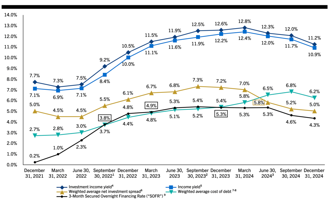 At the same time, GBDC’s cost of debt only declined by 60bp to 6.2%. Moreover, a higher proportion of the GBDC’s own debt financing is in fixed rates. This means the net investment spread declined with the Fed rate cuts.