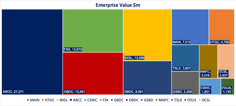 BXSL is one of the only 4 BDCs with a $10 billion plus Enterprise Value, ahead of GBDC.