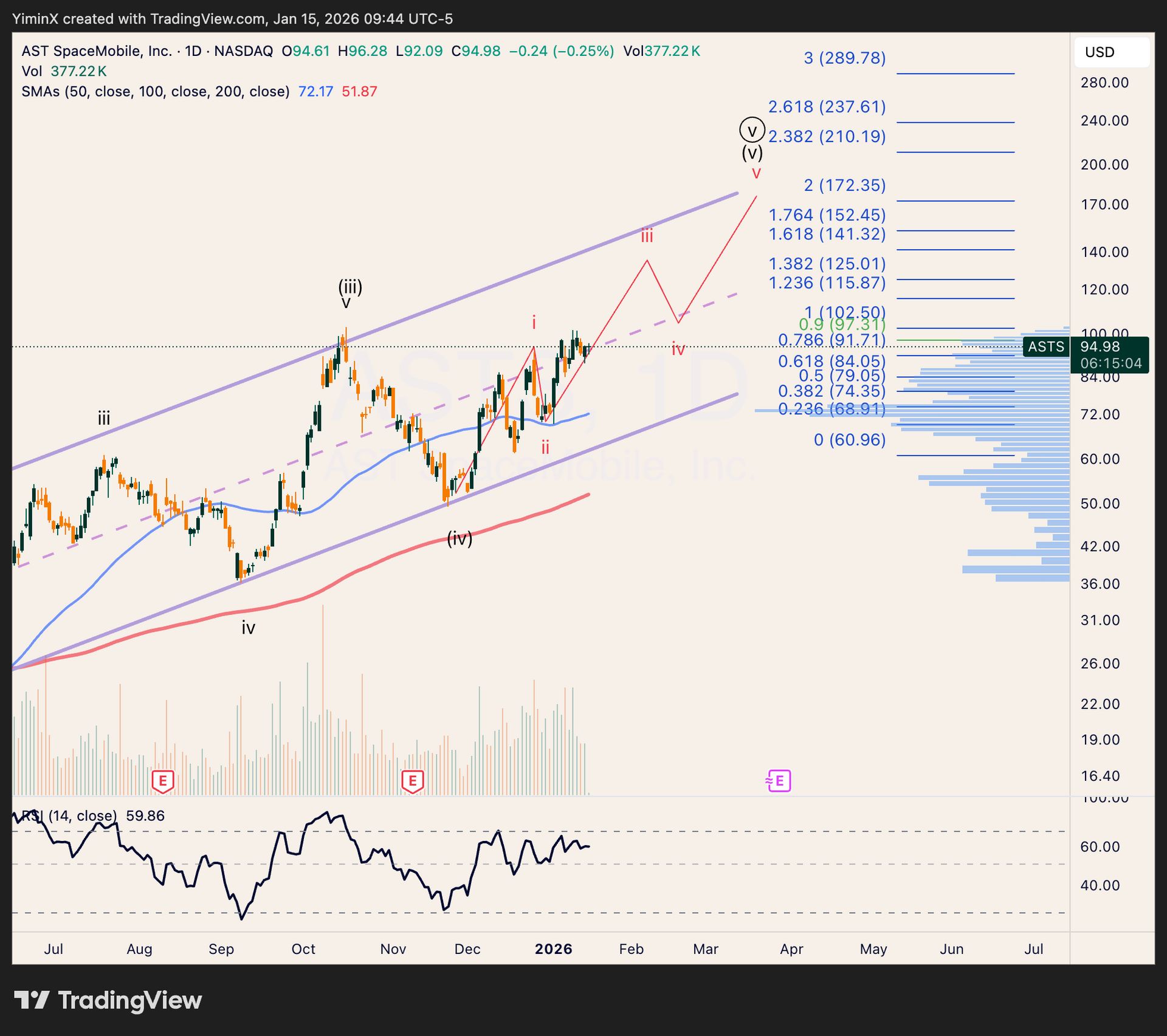 While momentum seems to have stalled, ASTS remains favourable to move past the all-time high again. Wave iii could complete above $125.