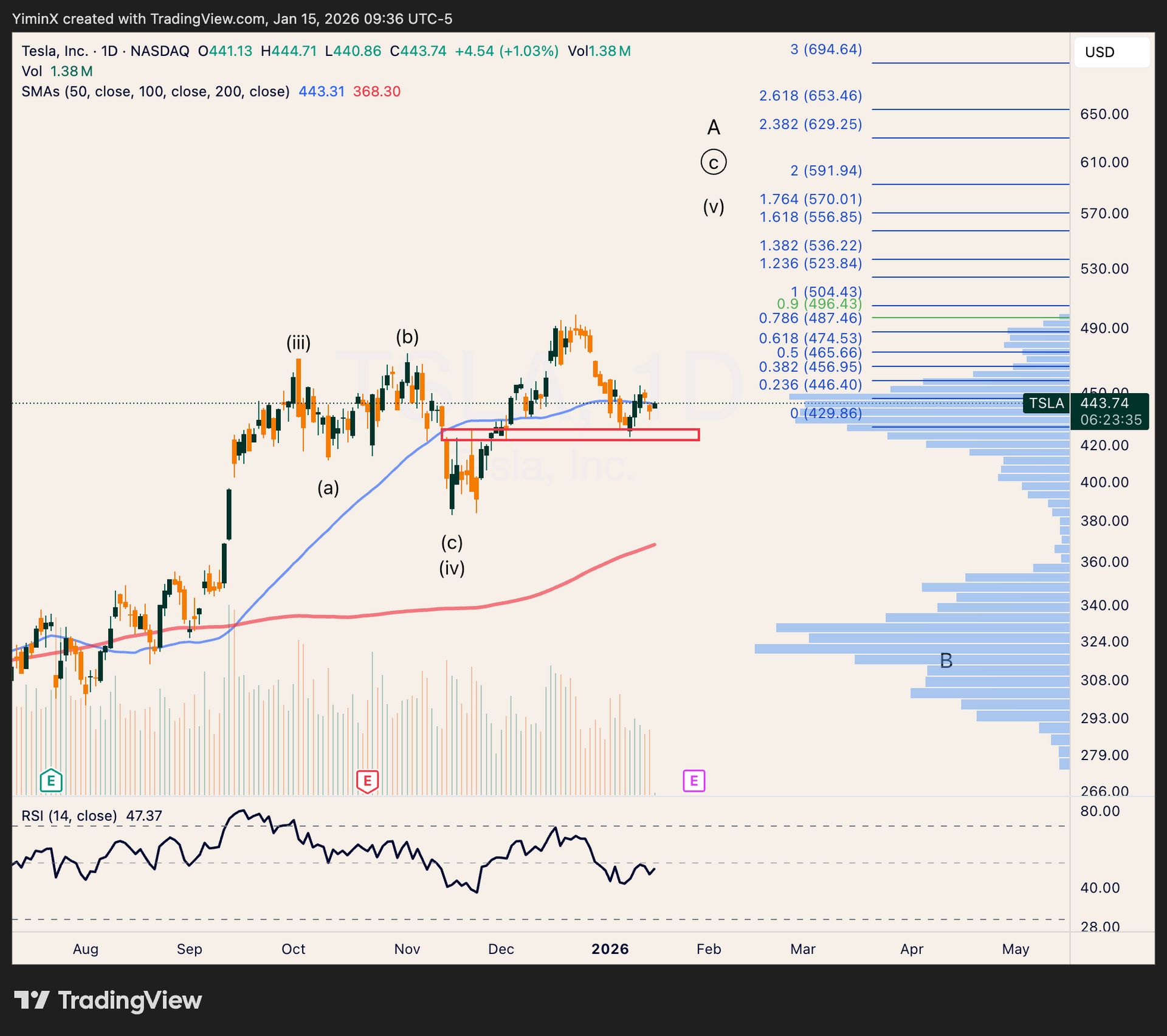 TSLA appears to be in a fairly neutral zone. It is consolidating around the 50-day MA after a two-week decline, with a very dense volume profile. As it holds above the November high (highlighted by the red box), the overall trajectory remains favourable towards the $540 target next.