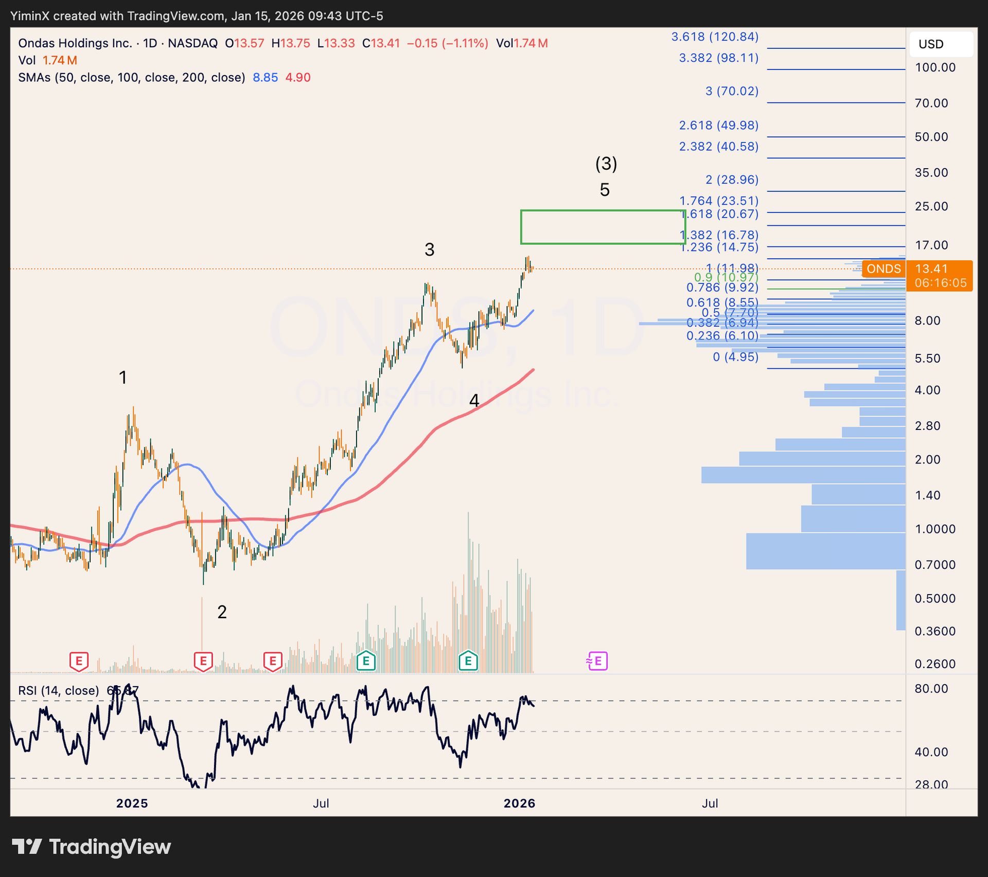 ONDS appears to be moving in wave 5 of (3). Wave 5 could reach a target of $17-23. There is little resistance between the current price point and the target zone.