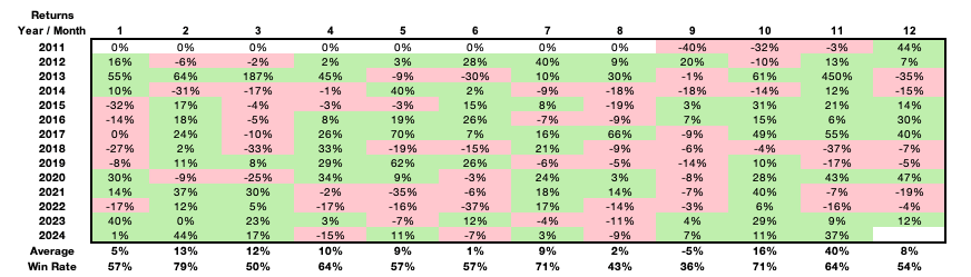 Bitcoin tends to do very well in February, July, and October, with more than 70% success in these months over the last ten years. In contrast, August and September are poor performing months with less than 50% win rate.