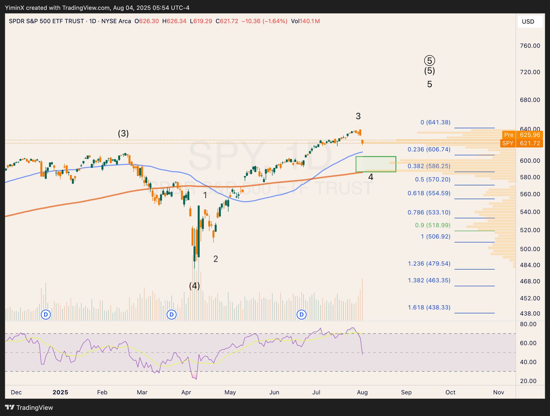 The current pullback could be the start of a wave 4, which is a 3-wave structure (a-b-c). Wave 4 here could end between $586 and $606 as the 0.236-0.382 retrace of wave 3.