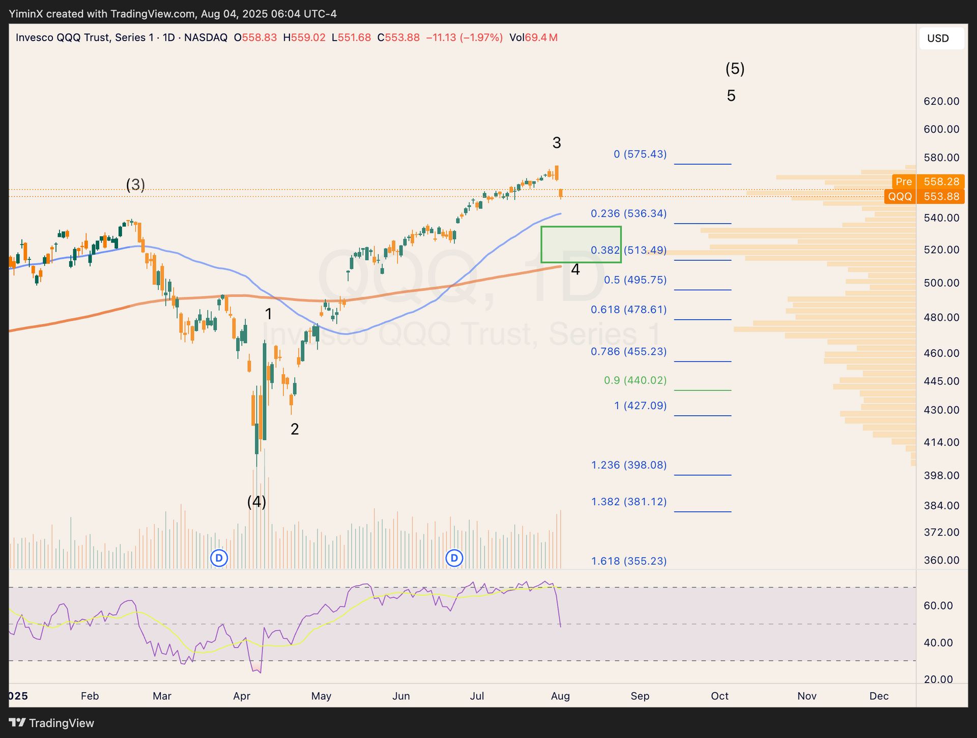 For QQQ, a similar logic applies. The pullback in wave 4 can test the $513-536 region, just above the 200-day MA, with a heavy volume profile in the region.