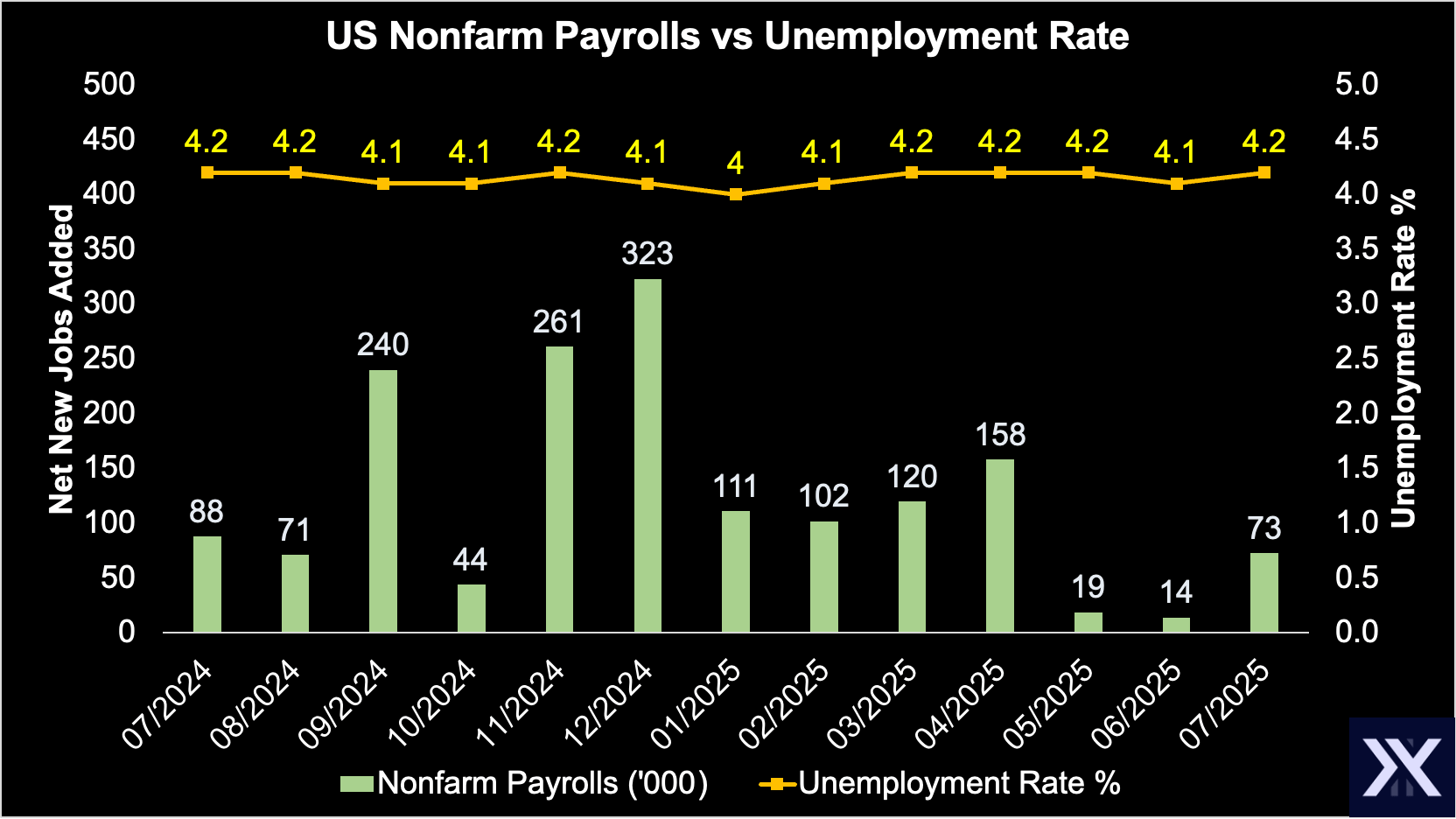 US Nonfarm Payrolls in July saw 73k net new jobs added, missing the 106k Wall Street expectation. Unemployment Tate also ticked up by 0.1% to 4.2%, although this was in line with the consensus.