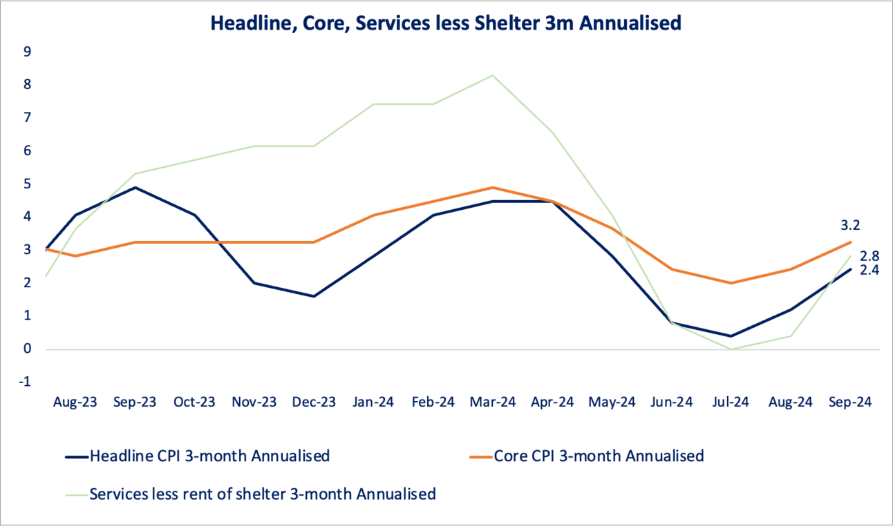 On a 3-month annualised basis, the Headline CPI, Core CPI, and Services less rent, have all accelerated upwards since July. While they are not yet in the trouble zone, it’s definitely not a welcoming trend in a rate cut cycle.