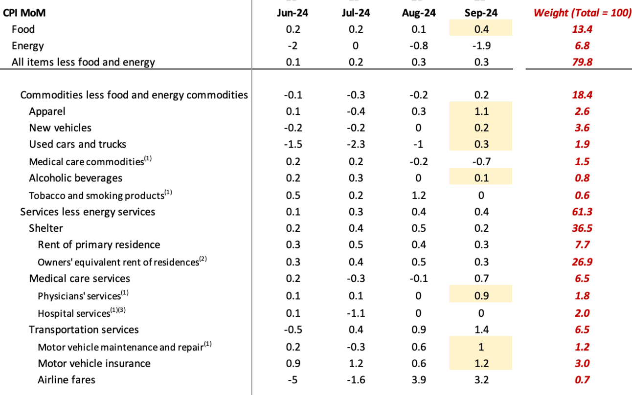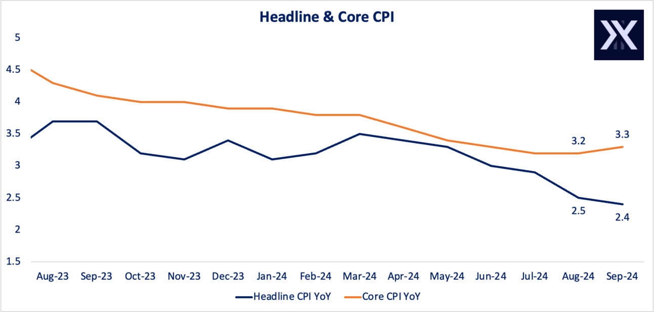 The September CPI figures now puts the Headline CPI 2.4% YoY, which continues the downward trend, but the Core CPI (CPI ex-food and energy) at 3.3% YoY, a move in the wrong direction.