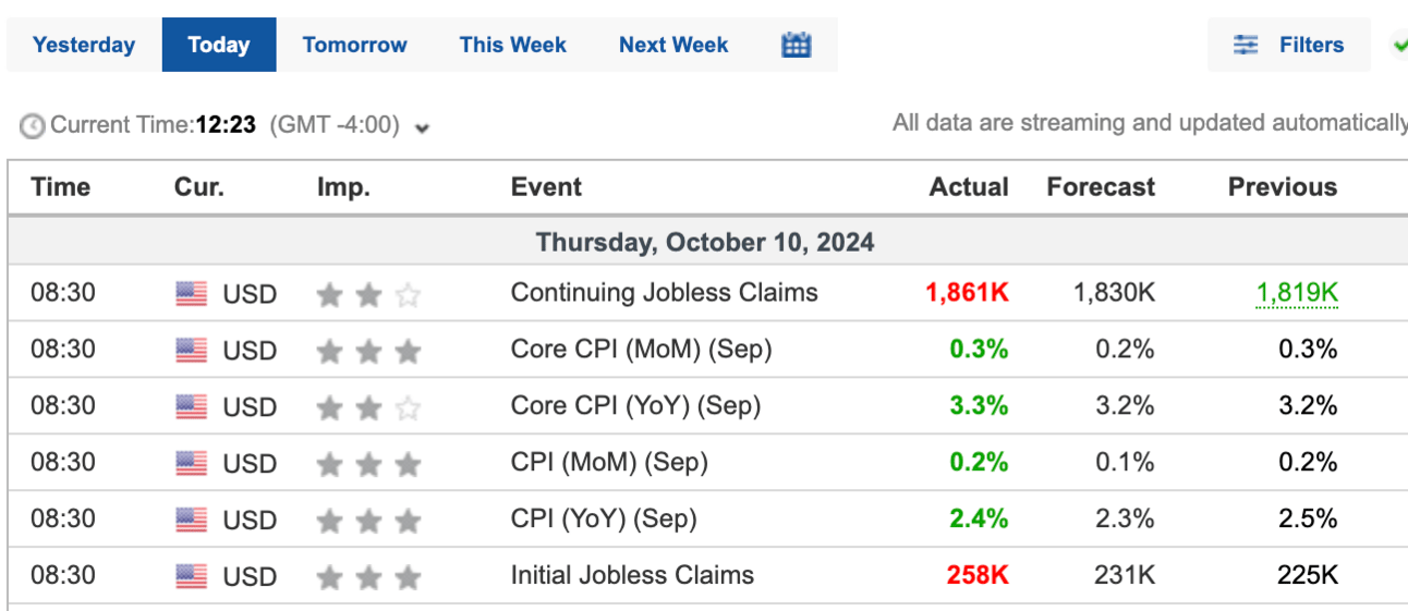 The economic data released this morning were likely not what the Fed wants to see. The Headline CPI and Core CPI printed 0.2% and 0.3% MoM respectively, both 0.1% higher than expected. Initial jobless claims came in at 258k, 27k higher than expected. Continuing claims also beat the forecast.