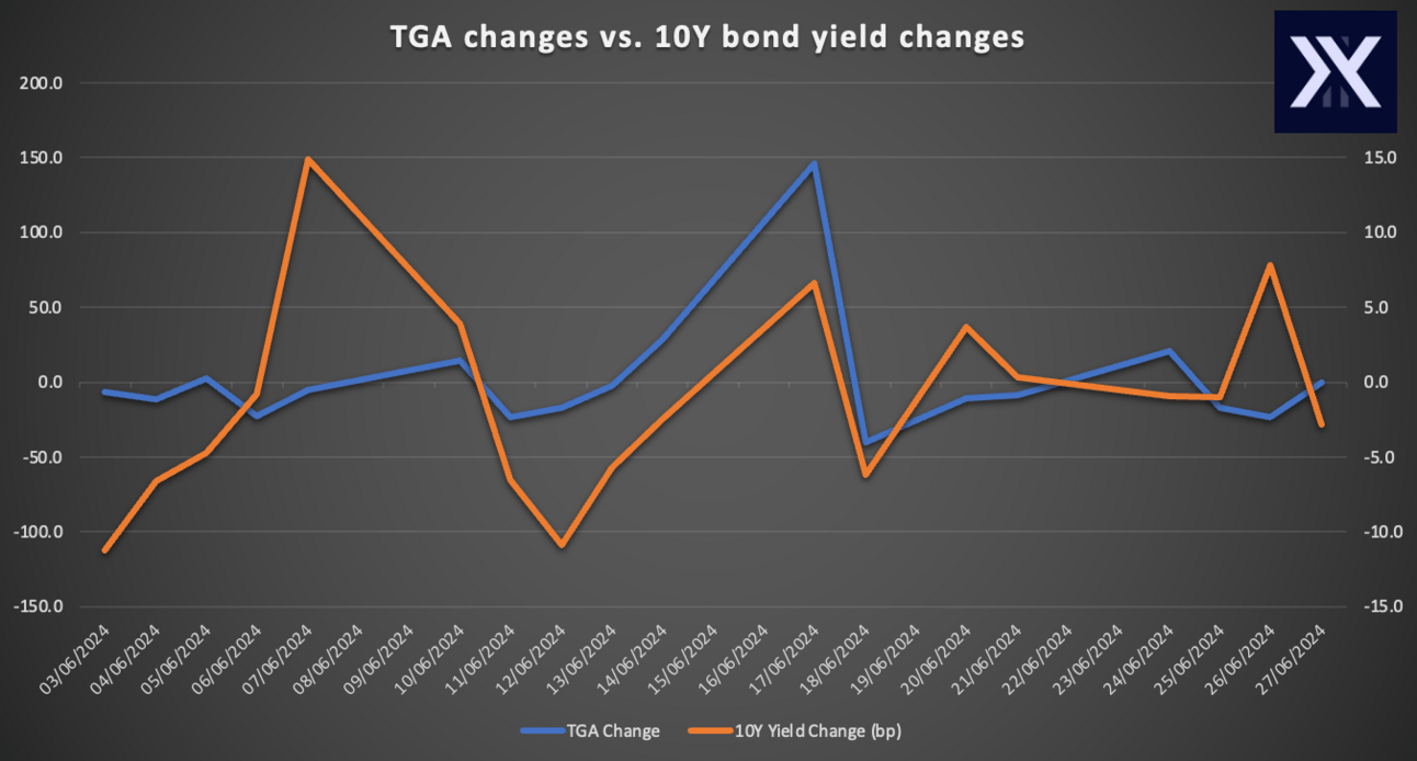 The TGA balance has a moderately positive correlation with the Treasury yield. When the TGA rises, yields tend to come up as well. You can see that being the case in the chart above, until the June month end.