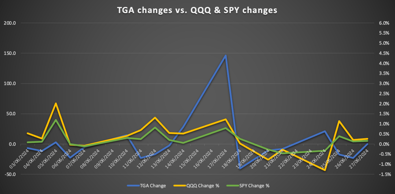 The TGA balance is sometimes negatively correlated with equities, represented by QQQ and SPY in the chart above. Unfortunately, there was no obvious pattern in June.