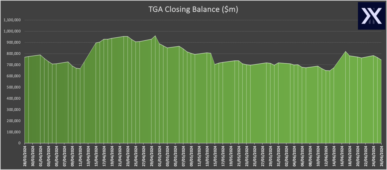 The Treasury General Account (TGA) can be thought of as the main "checking account" for the US government, where the US Treasury maintains and manages its funds to conduct daily operations.