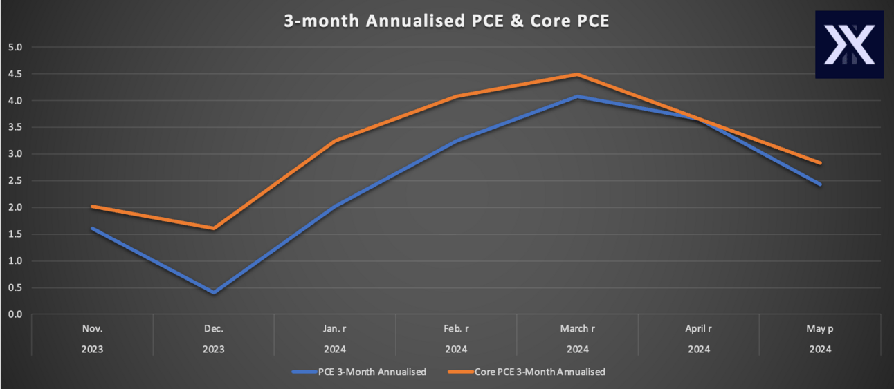 PCE and Core PCE both dipping on a 3-month annualised basis.