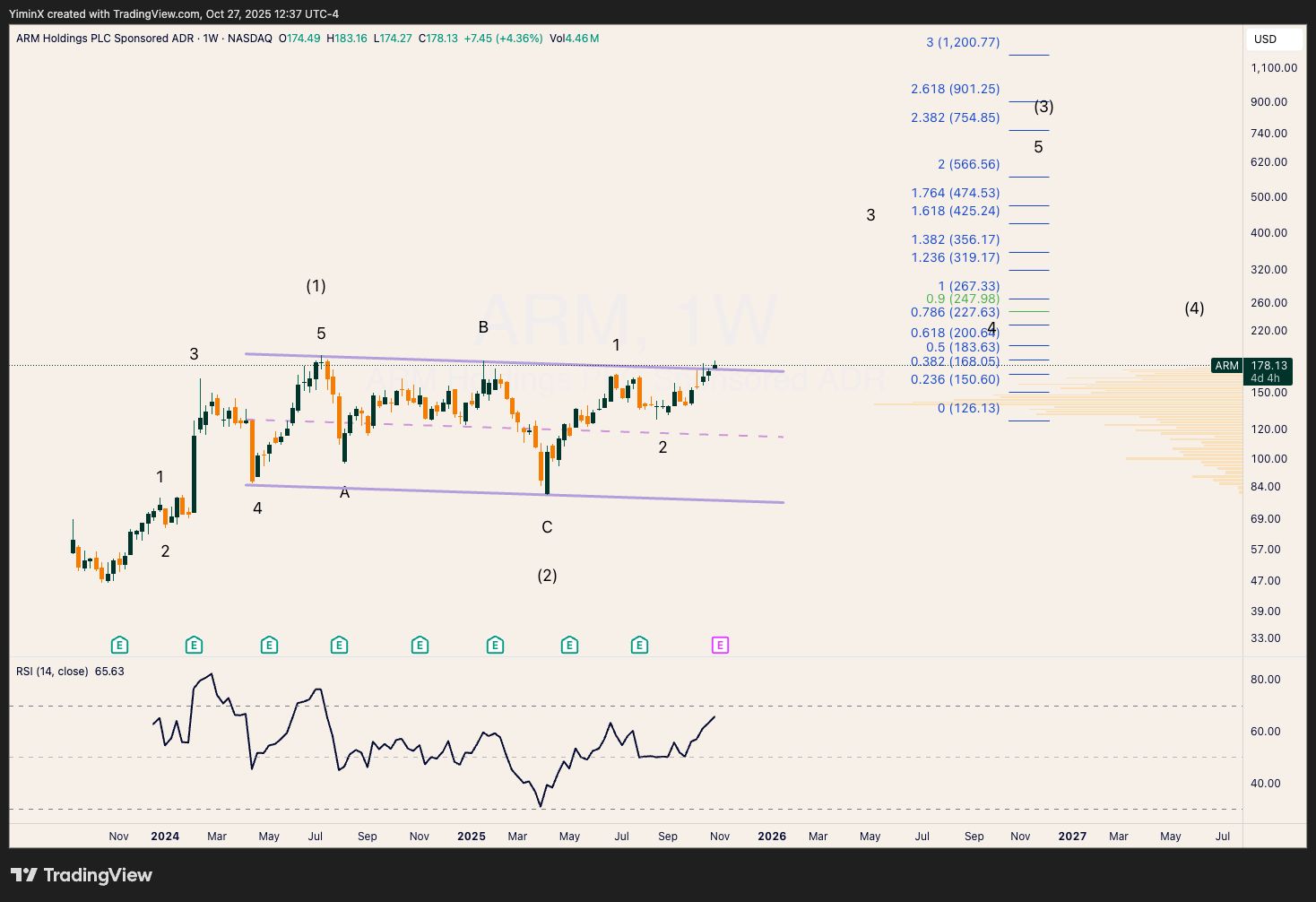 ARM appears to be finally breaking out of its 2-year consolidation zone. The wave 3 target could double the price from here to $350+.