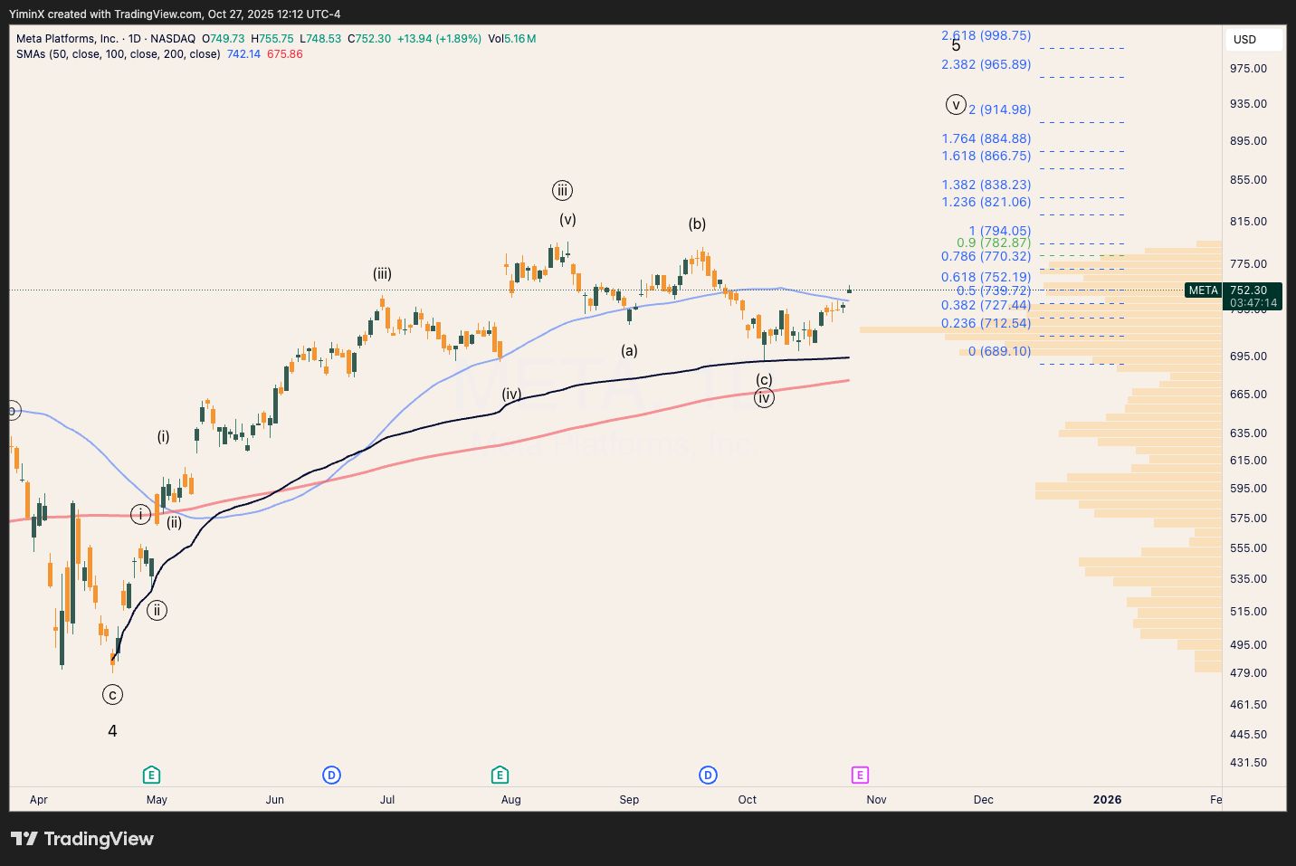 Meta has climbed above the 50-day MA today. With earnings this week, there is a reasonable chance that META has jump-started its wave circle-v, targeting $840-900.