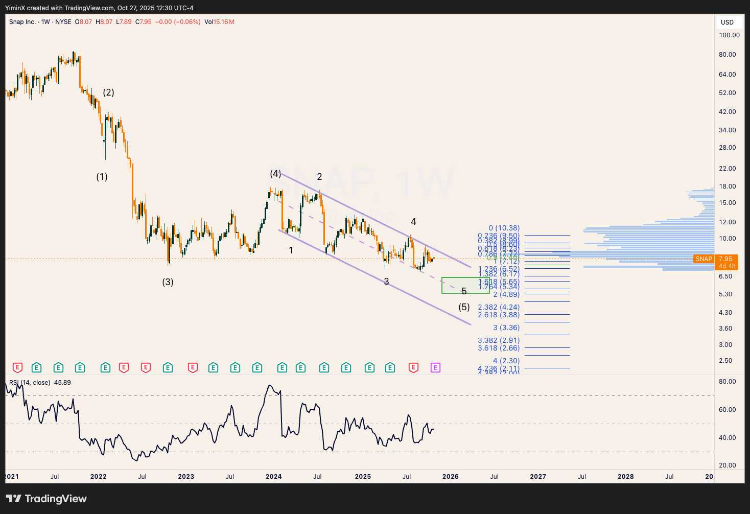 Since 2022, SNAP has bounced off the $7-8 handle every time. However, the chart looks less optimistic this time around. SNAP could be en route to completing wave 5 of (5) near $6 to finish the entire bear cycle.