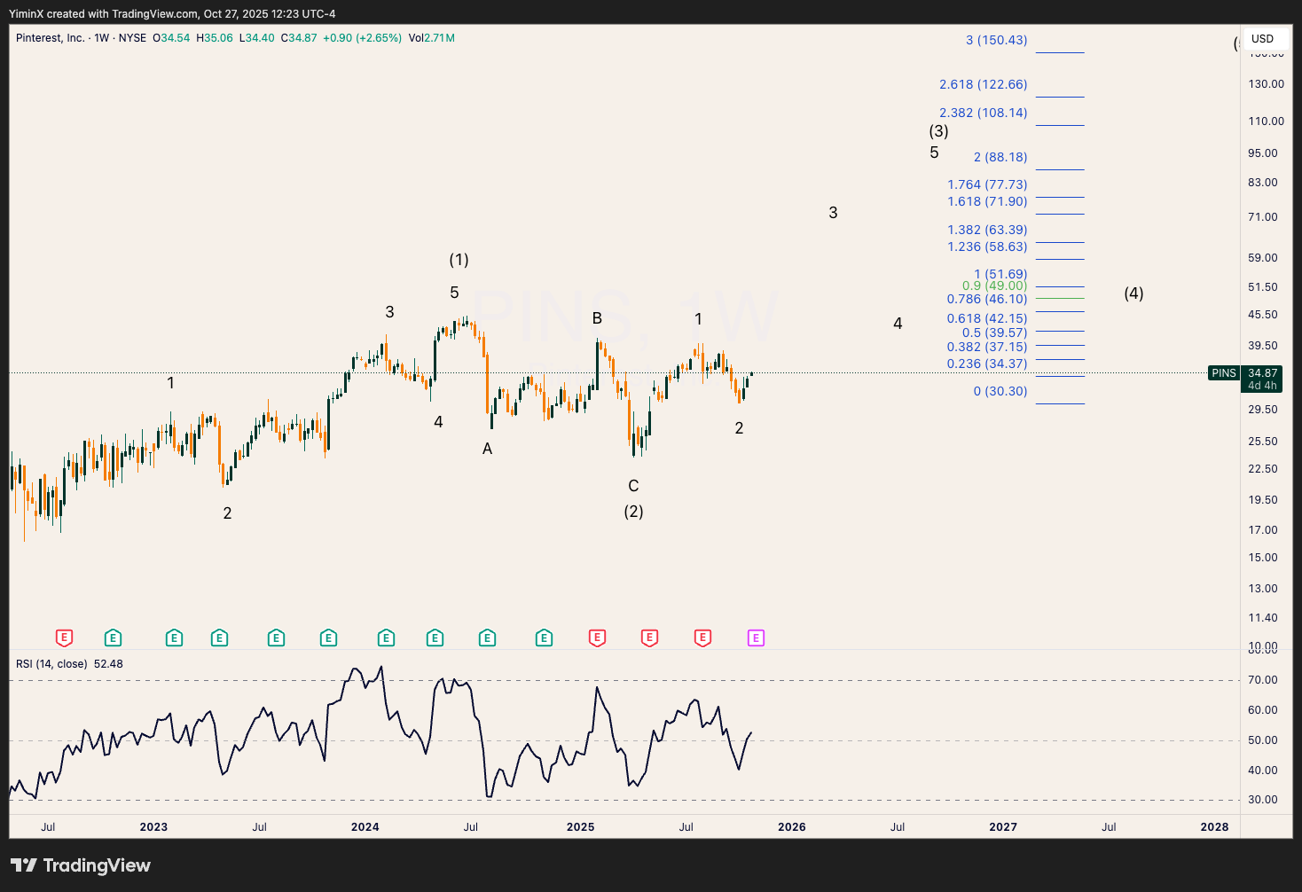 PINS could have created a (1)-(2)-1-2 setup here ahead of earnings. Wave 3 of (3) could target over $63+ at the 1.38 extension of wave 1.