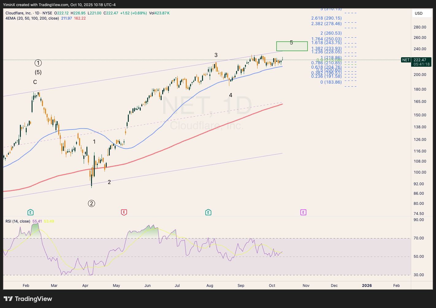 NET is likely in wave 5 of its rally from the April low. Wave 5 may stretch into the $240-250 region, but the risk-reward is unattractive at this point.