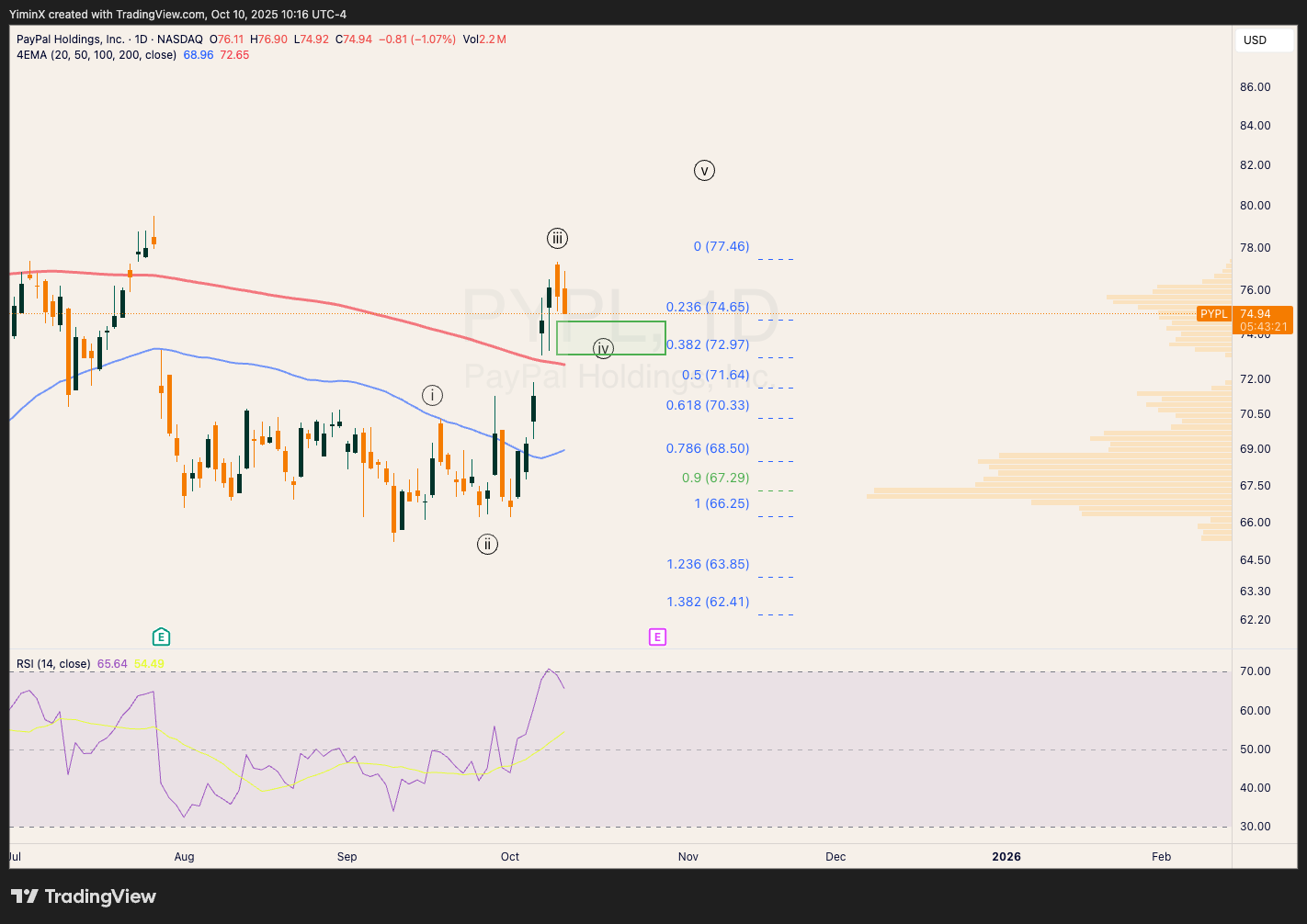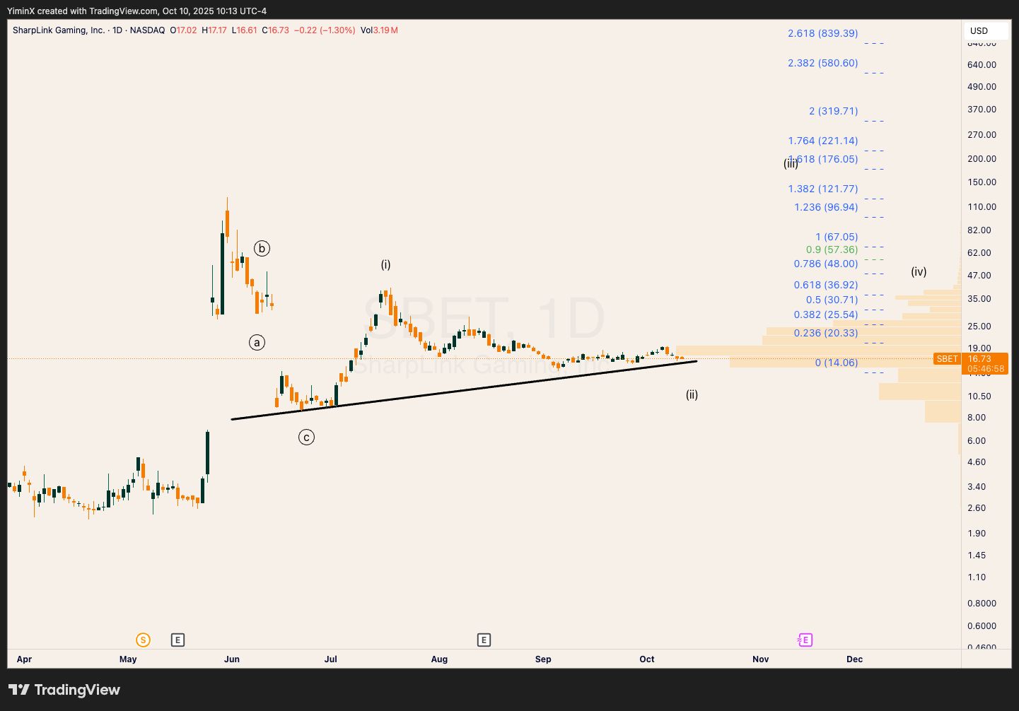 The volume profile suggests heavy accumulation between $15 and $20. Upon take off, SBET could race towards the wave (iii) target above $120.