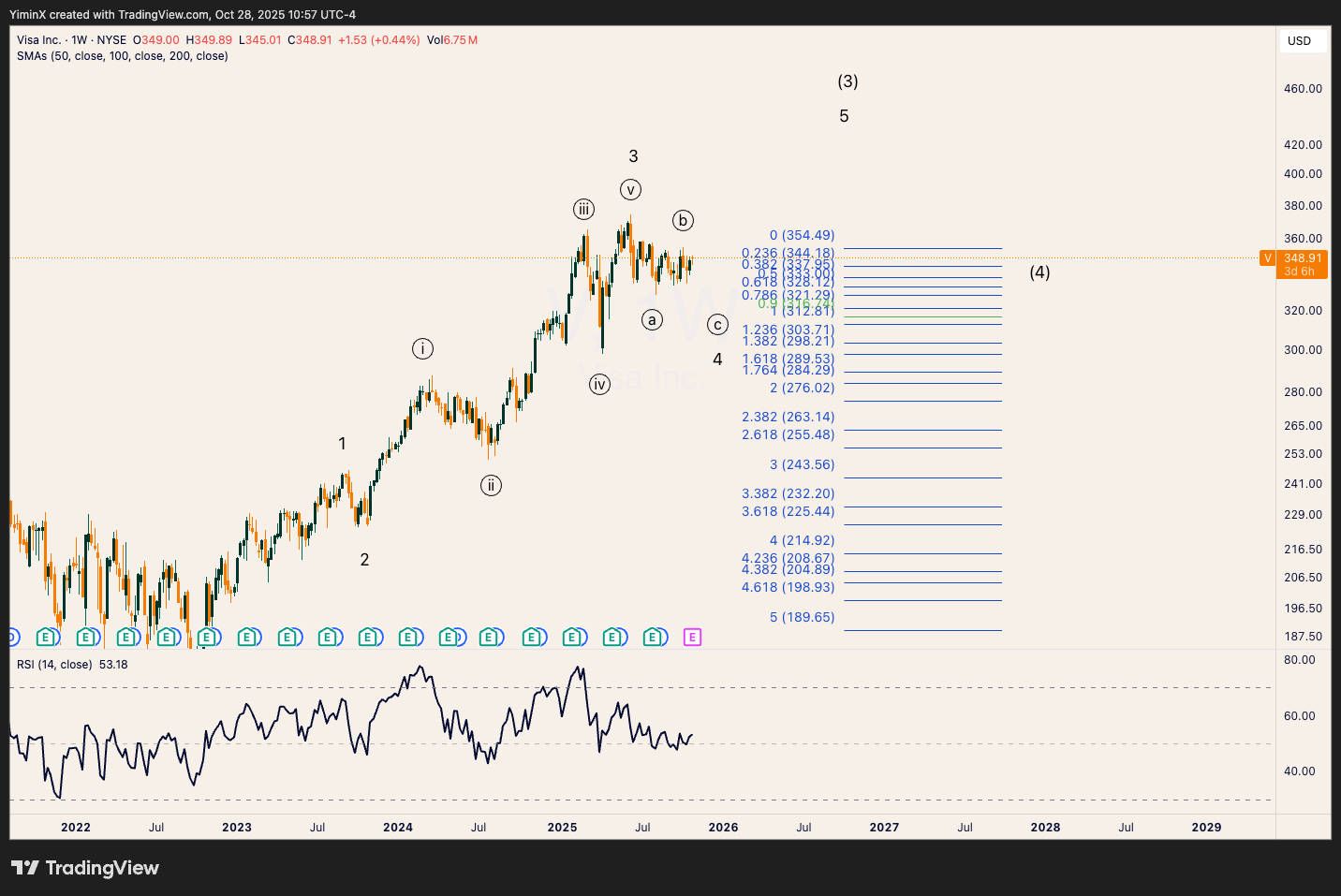 Visa reports earnings tonight. There is a chance that wave 4 has not sufficiently completed. If we get a pullback below $310, it is an attractive entry for wave 5 of (3). Wave 5 could target $420+.