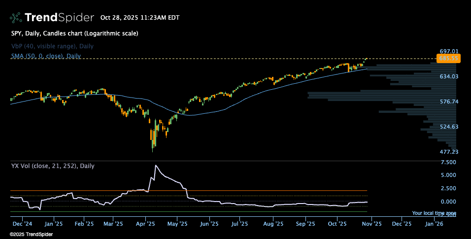 SPY’s uptrend remains remarkably steady. Volatility has ticked higher recently but still sits below its 1-year average. This is a healthy backdrop for trend continuation.