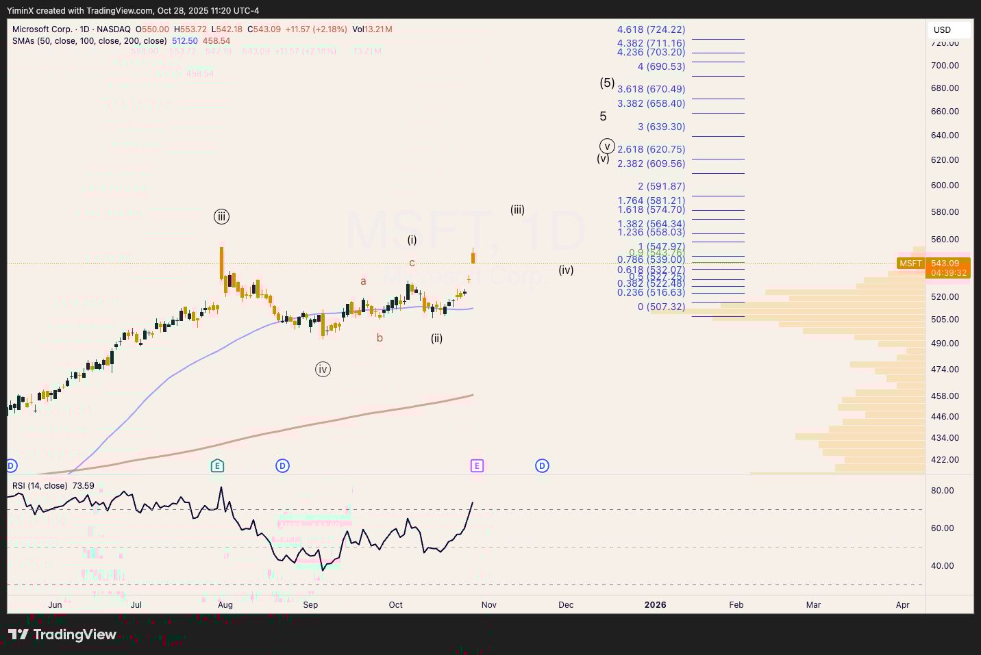 MSFT has moved up 2% today, potentially underway in wave (iii) of circle-v here. Because of the a-b-c structure of wave (i) of circle-v, the shape of the final climb could be an ending diagonal, where wave (iv) overlaps wave (i) down the line.