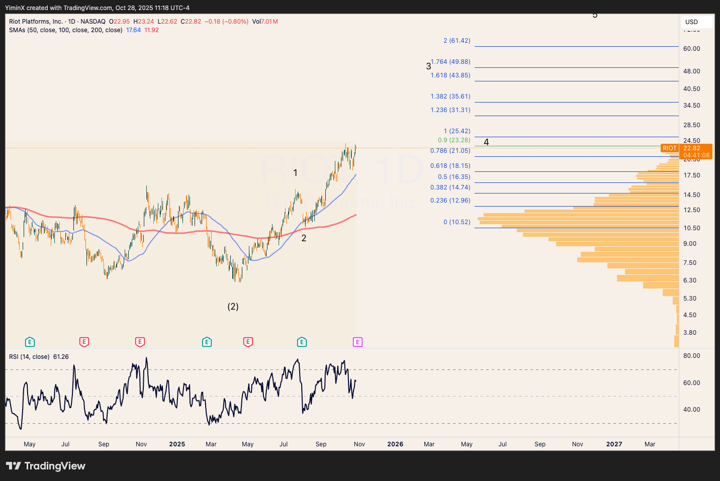 Having more than tripled since the April low, RIOT appears to be progressing in wave 3 of (3).